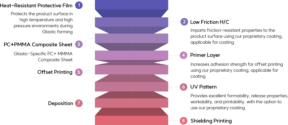 With the skin layer and the core made up of PMMA and PC, respectively, this product provides excellent exterior and quality and ensures convenient printing and packaging.